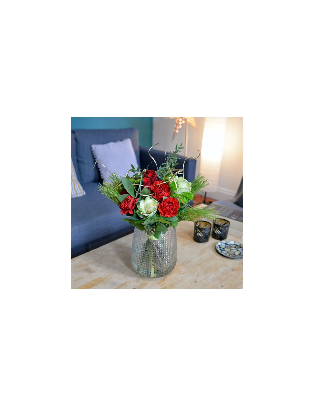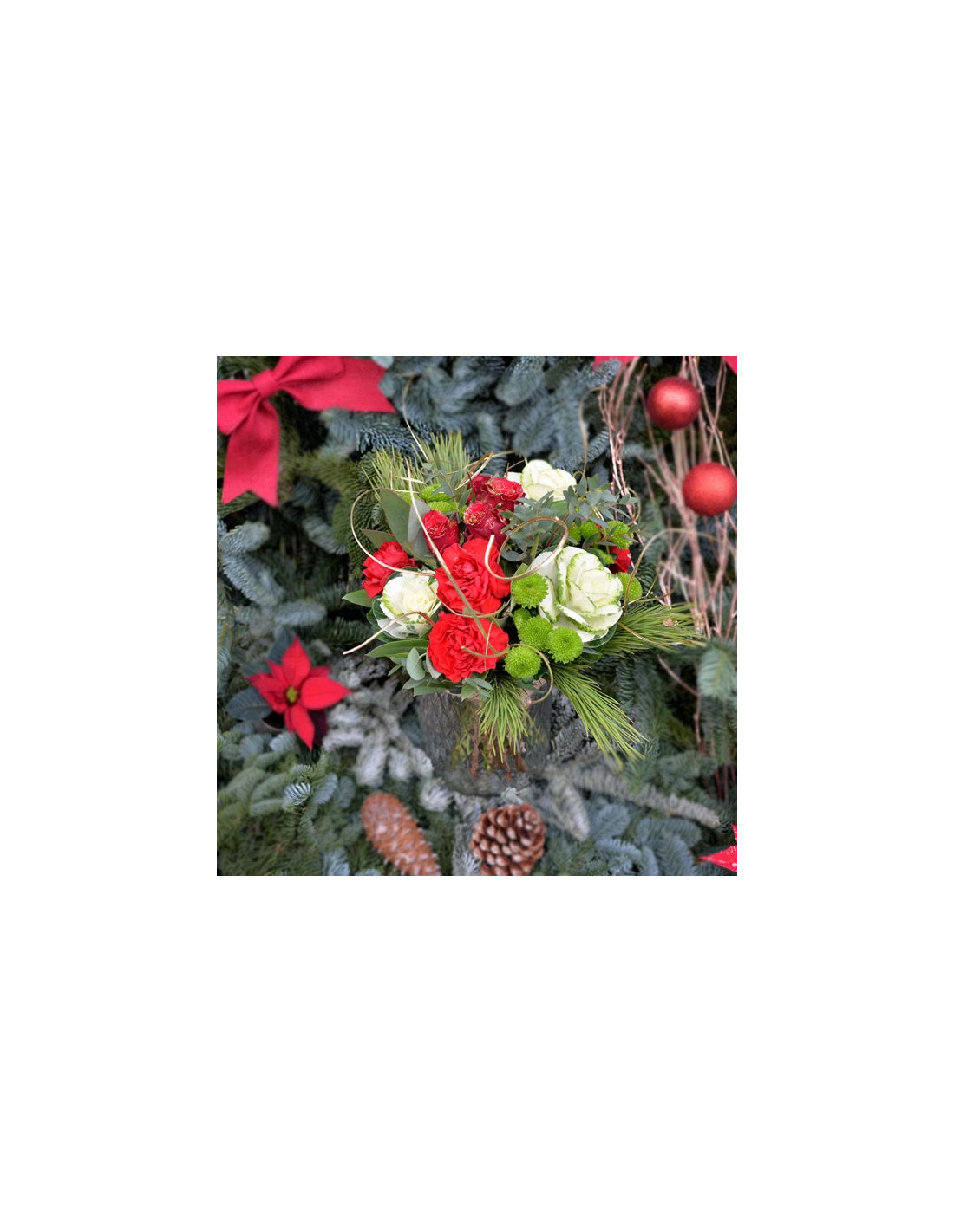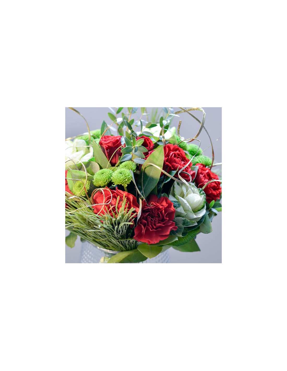 Un bouquet rond dans les tons de rouge, vert qui vous plongera de suite dans l'esprit de Noël, composé entre autres fleurs de roses et oeillets rouges, santinis verts, feuillage pinus et eucalyptus, accessoires or.