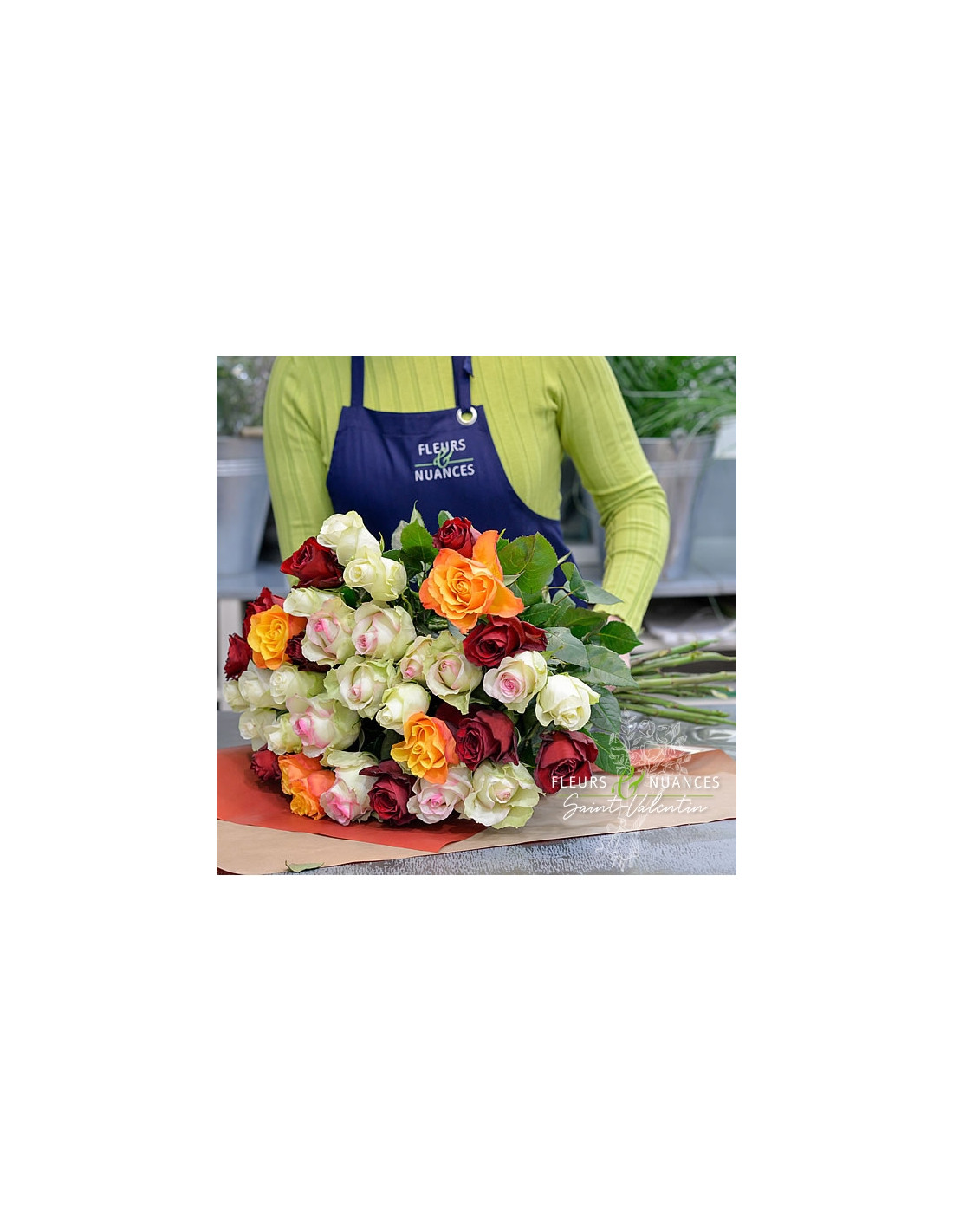 Un bouquet de grandes roses gros boutons, hauteur de la tige 70cm, variété premium, en couleurs mélangées.